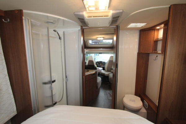 Lit double en position médiane à l’arrière avec de nombreux rangements + lit de pavillon au dessus du carré à l’avant.