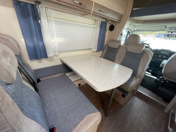 Belle salle à manger avec des sièges à la fois dans le sens du conducteur et dans le sens opposé.